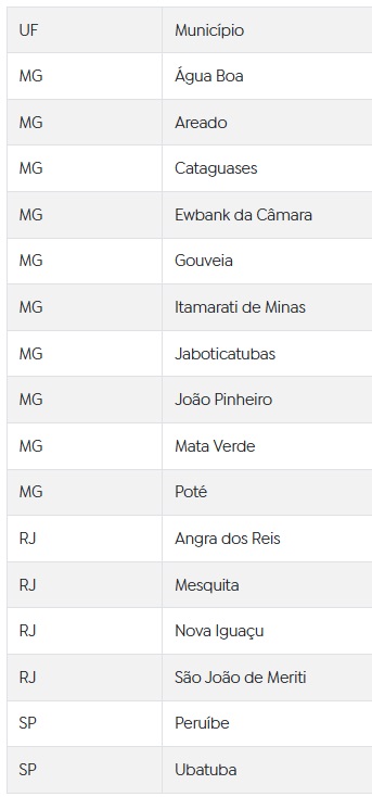 A maioria das cidades citada no documento estão em Minhas Gerais. Oito tiveram a situação decretada em decorrência de chuvas intensas e uma por conta de inundações. O número de mortos no estado passou de 70.