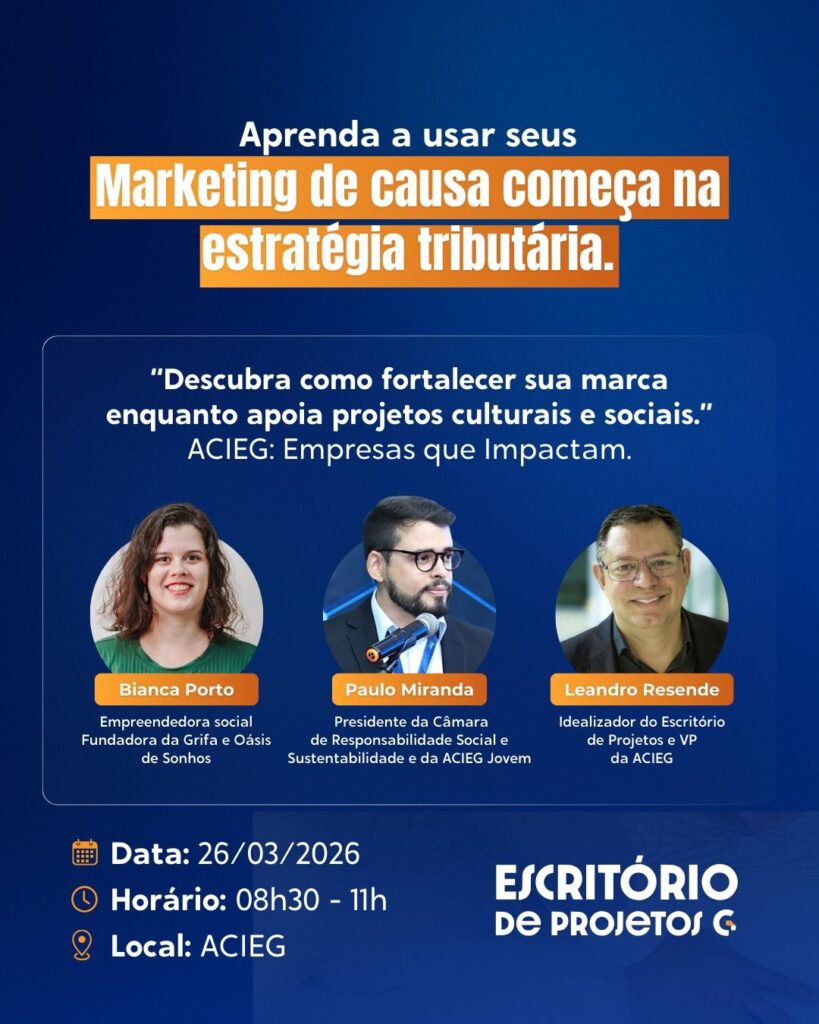 Goiânia – A Associação Comercial, Industrial e de Serviços do Estado de Goiás (Acieg) realiza encontro sobre como empresas podem transformar estratégia tributária em posicionamento de marca e impacto social. O evento será realizado no dia 26 de março, das 8h30 às 11 da manhã, em Goiânia. As vagas são limitadas e as inscrições gratuitas pelo formulário: https://forms.gle/LsMAZuHinwePTLZL7