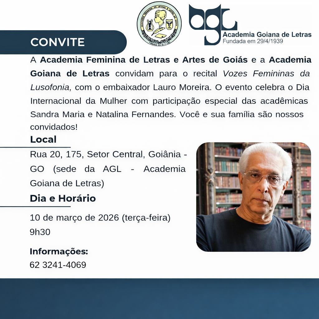 Goiânia – A Academia Feminina de Letras e Artes de Goiás e a Academia Goiana de Letras vão realizar nesta terça-feira, dia 10, às 9h30, na sede da AGL, à rua 20 n° 175 – centro, em Goiânia, um encontro especial, o Recital: Vozes Femininas da Lusofonia, com o embaixador Lauro Moreira.
