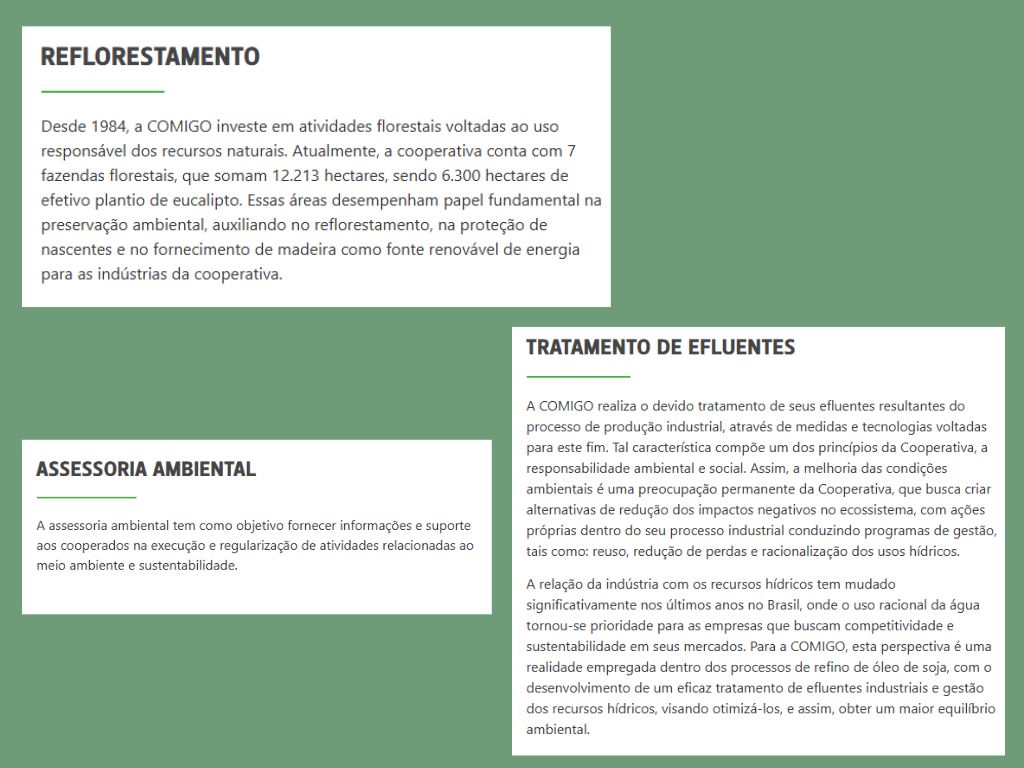 As operações são conduzidas de modo a mitigar ao máximo o impacto ambiental, tendo como exemplo seu pioneirismo na implantação de florestas plantadas para geração de biomassa necessária em suas indústrias. Outro exemplo é a implantação de parques de energia solar e o reaproveitamento de água nas operações industriais. Sob a perspectiva da governança, possui uma gestão participativa dos membros, cujas decisões são aprovadas em assembleia”, destaca.