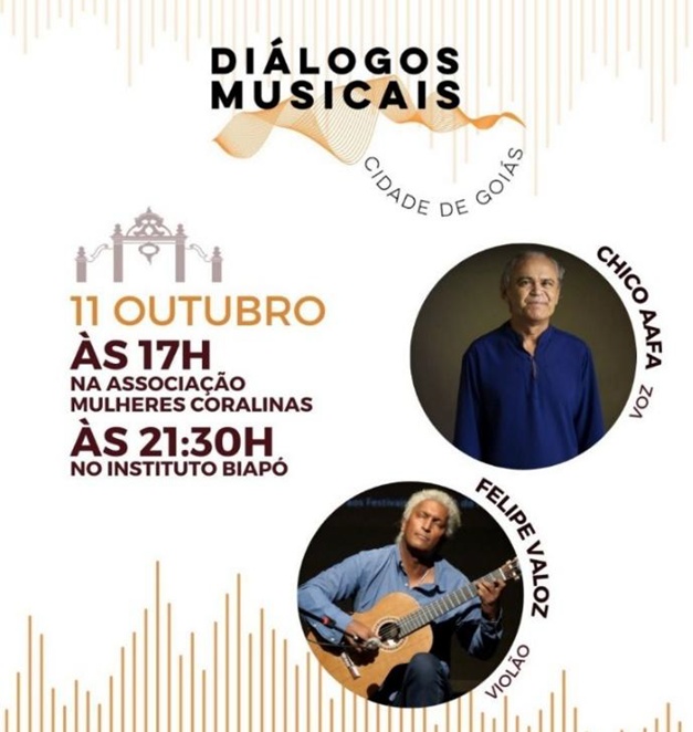 Goiânia - O cantor e compositor Chico Aafa e o violonista Felipe Valoz são os convidados da próxima edição dos Diálogos Musicais, que será realizado no dia 11 de outubro (sábado) em Goiás (GO). A iniciativa é promovida pelo Instituto Biapó e o Serviço Social do Comércio de Goiás (Sesc Goiás), com apoio do Museu Casa de Cora Coralina, Rádio Nova Fogaréu, Restaurante Flor de Ipê e Associação Mulheres Coralinas.
