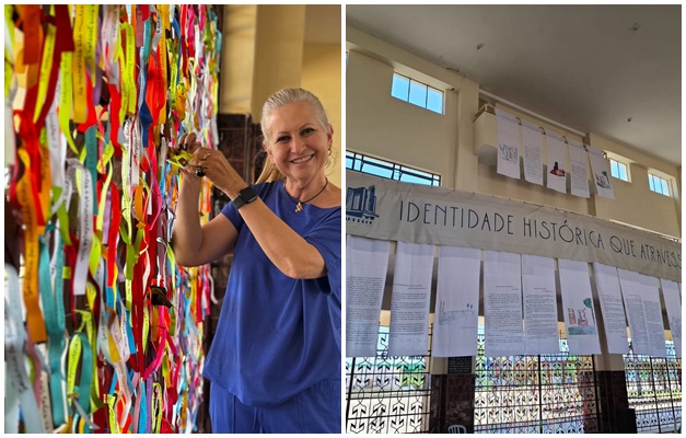Maria da Luz Santos Ramos ao lado das fitas coloridas com frases selecionadas / Textos premiados foram expostos na mostra aberta na Antiga Estação Ferroviária