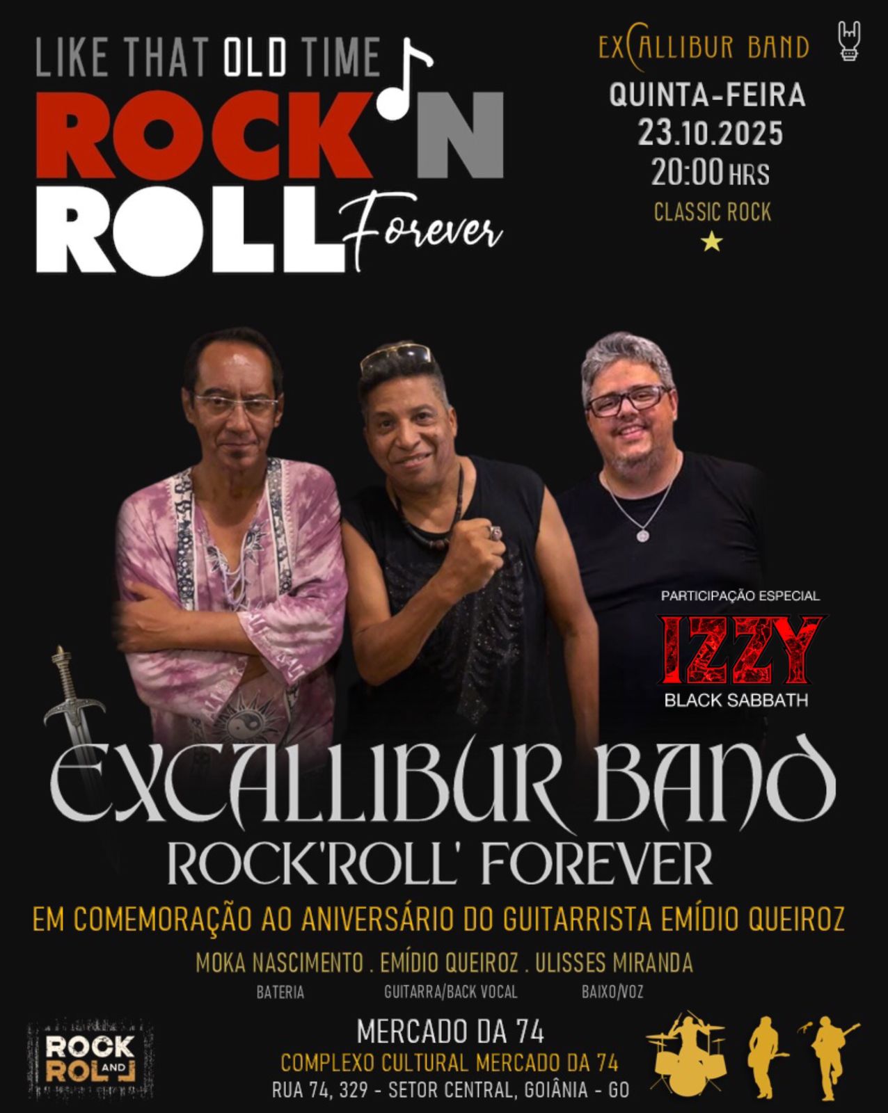 Goiânia – Nesta quinta-feira (23/10) às 20h, o Complexo Cultural Mercado da 74, no Centro de Goiânia, recebe a Excallibur Band com o show “Forever Rock”, em comemoração ao aniversário do guitarrista Emídio Queiroz. O evento terá a participação especial da banda Izzy composta por Luiz Jr. (Voz); Marcos Pablo (guitarra base); Charles (guitarra solo); Layssom Mesquita (baixo) e Lucas Santos (bateria), em um repertório com músicas do Black Sabbath.