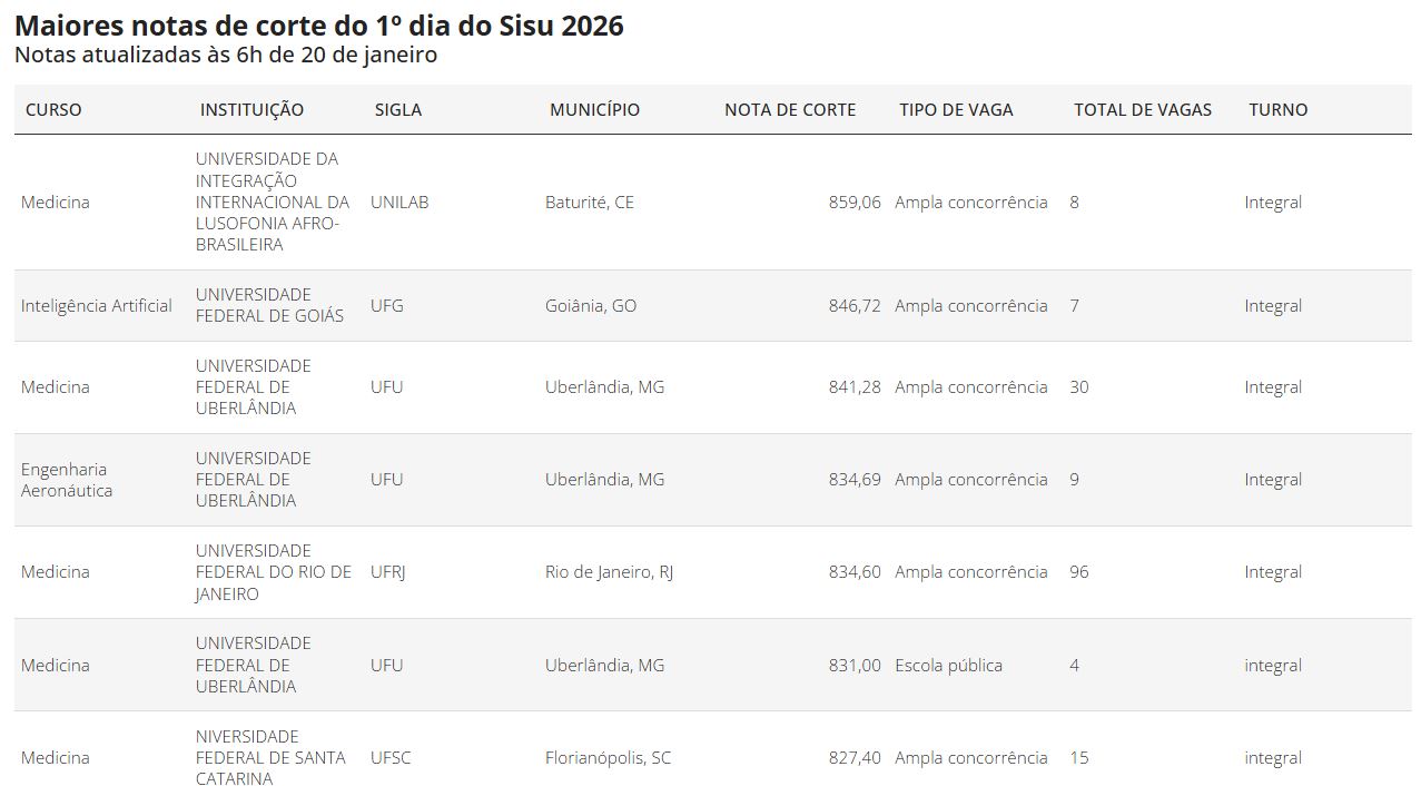 Goiânia – Com nota mínima de 846,72 pontos, o curso de Inteligência Artificial da Universidade Federal de Goiás (UFG) foi o segundo com a maior nota de corte do Sistema de Seleção Unificada (Sisu) 2026, no primeiro dia de inscrições, conforme dados parciais. A graduação ficou atrás apenas de Medicina, da Universidade da Integração Internacional da Lusofonia Afro-Brasileira, de Baturité (CE). As notas parciais foram divulgadas na terça-feira (20/1).