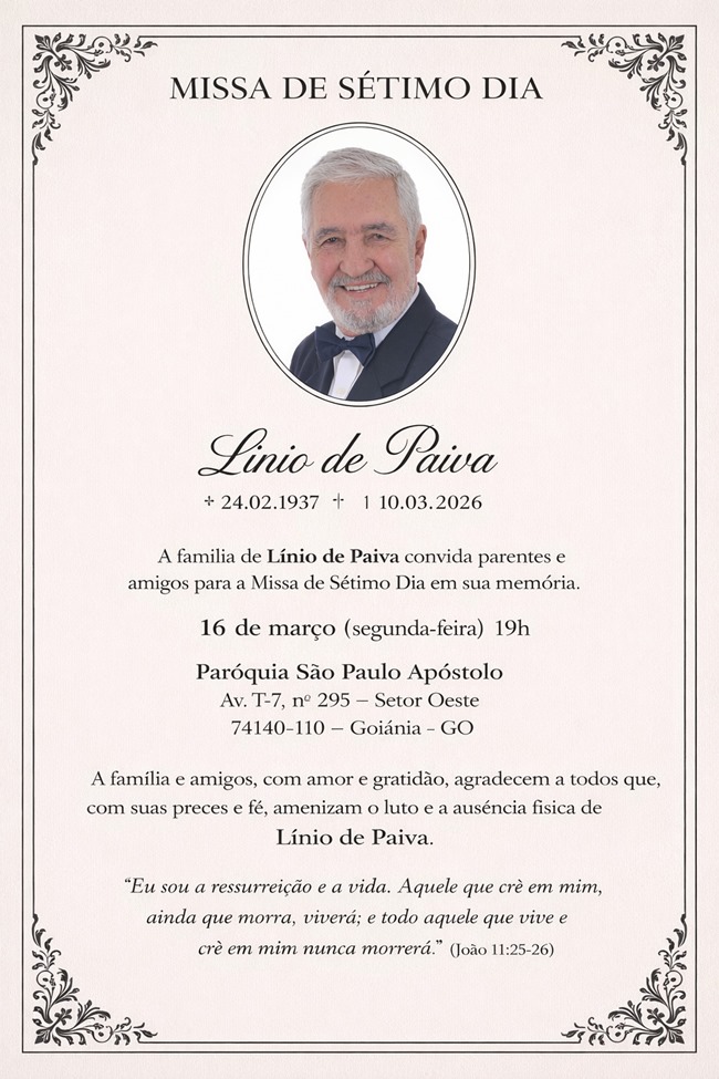 Goiânia – Familiares de Línio de Paiva convidam para a Missa de Sétimo Dia em homenagem à sua memória. A celebração será realizada nesta segunda-feira (16/3), às 19h, na Paróquia São Paulo Apóstolo, localizada na Avenida T-7, nº 295, Setor Oeste, em Goiânia.