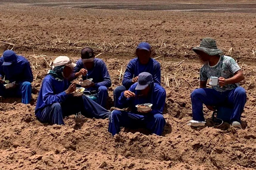 Trabalhadores resgatados em fazendas próximas a João Pinheiro (MG) eram obrigados a fazer as refeições no meio da plantação de cana de açúcar, debaixo de sol forte. Foto: MPT-MG.