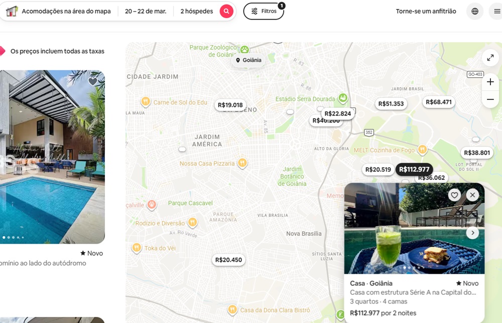 A reportagem fez uma consulta no site Airbnb, plataforma digital global que conecta viajantes a anfitriões que alugam acomodações, como casas, quartos e apartamentos. Lá, há opções de aluguel por temporada em Goiânia que vão desde R$ 300 por duas diárias até valores que ultrapassam a casa dos R$ 100 mil, também por duas diárias no período do evento. Os preços variam de acordo com a estrutura do imóvel, a localização e os serviços oferecidos, refletindo o impacto direto da MotoGP sobre o mercado imobiliário temporário na capital goiana.