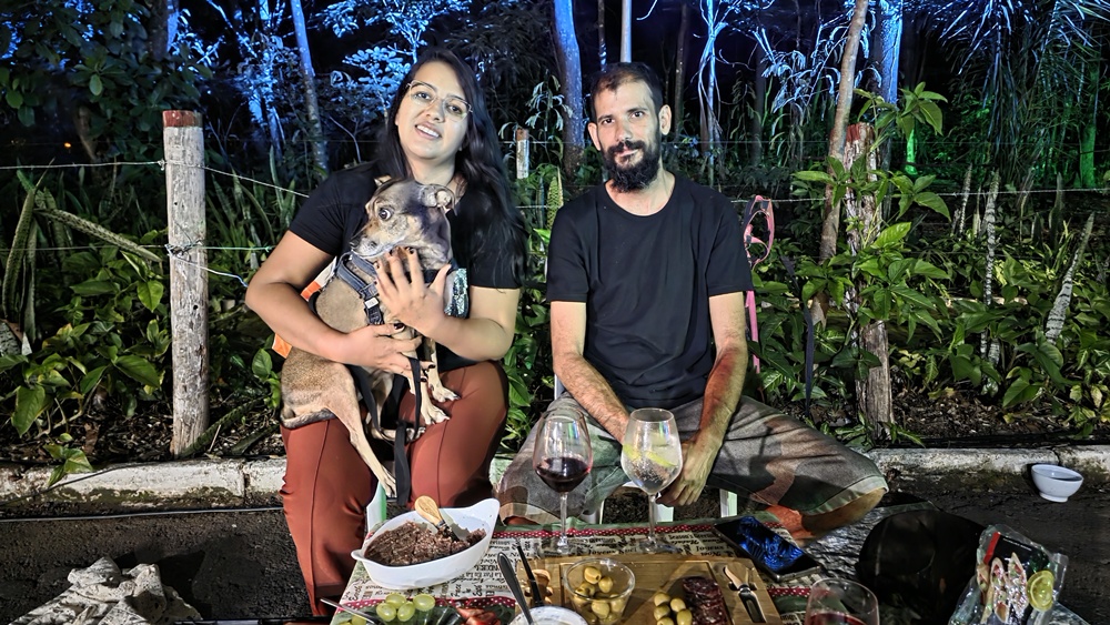 Ao lado do marido, Geovani Milek, e do cachorrinho do casal, ela conta que o evento é um momento pensado para ser vivido em família e destaca o ambiente criado pelo projeto. “A gente fica à vontade, é seguro”, diz, acrescentando que o espaço é acolhedor para diferentes públicos, inclusive para quem leva animais de estimação.