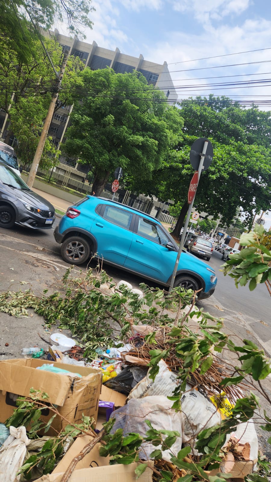 "Virou lixão", diz comerciante | 31.10.25 - 17:42 População reclama de descarte de lixo e entulho em frente ao TJGO Lixo e entulho na calçada (Foto do leitor)
