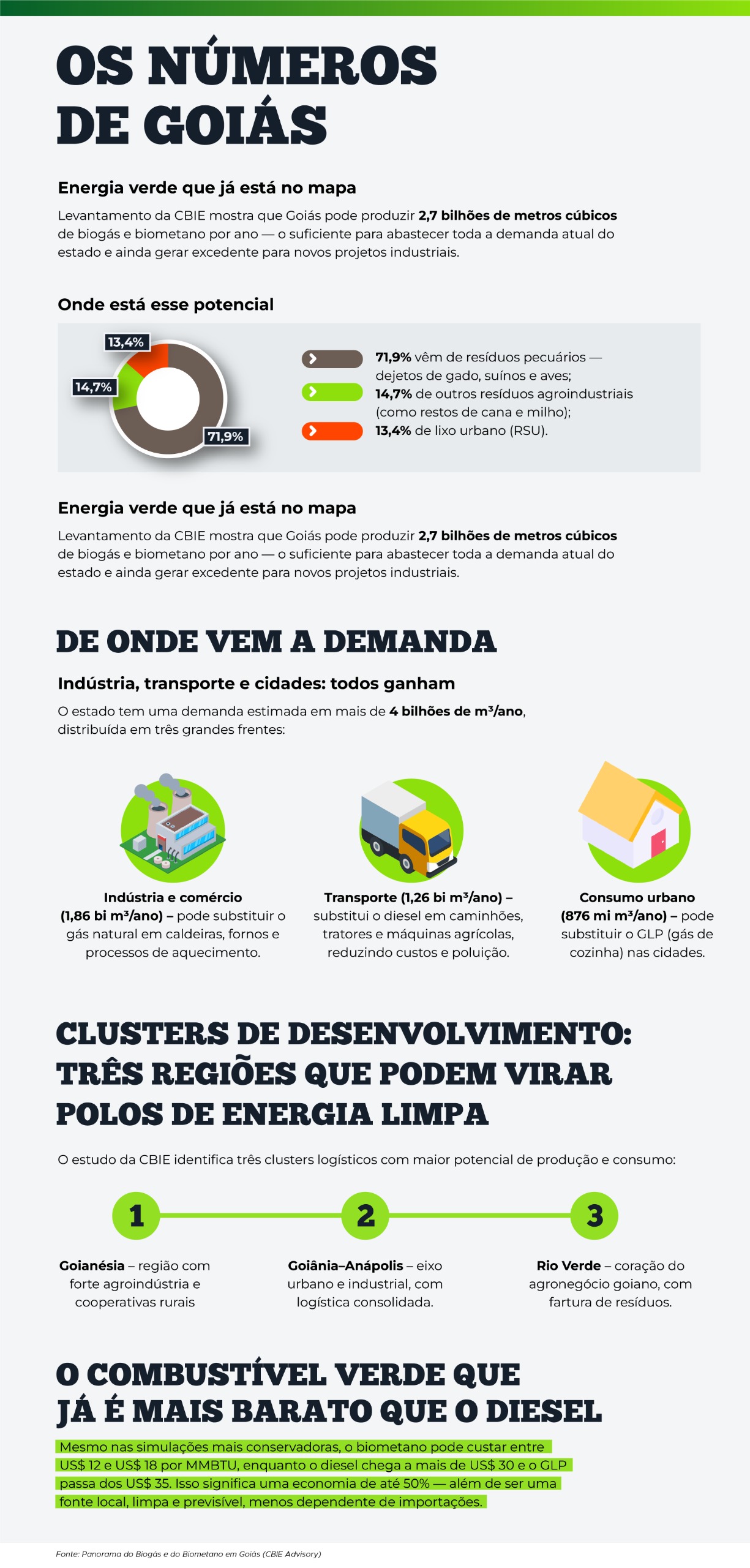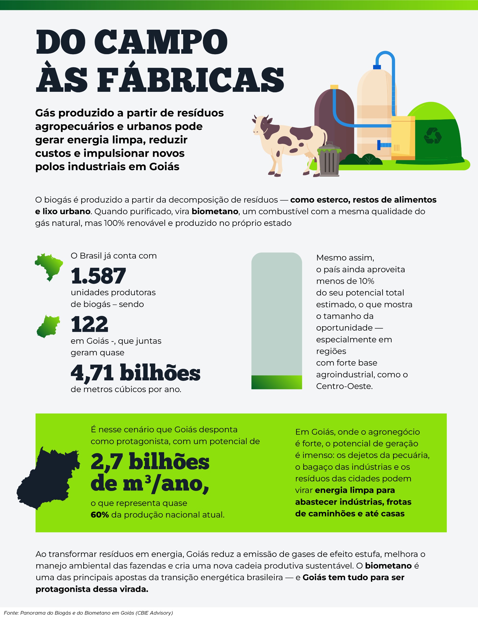 (Foto: Freepik)Levantamento divulgado pela CBIE Advisory - consultoria especializada em inteligência estratégica e regulatória para os setores de energia e saneamento básico - mostra que o Estado pode produzir 2,7 bilhões de metros cúbicos de biogás e biometano por ano, quantidade suficiente para abastecer toda a demanda atual goiana e ainda gerar excedente para novos projetos industriais.