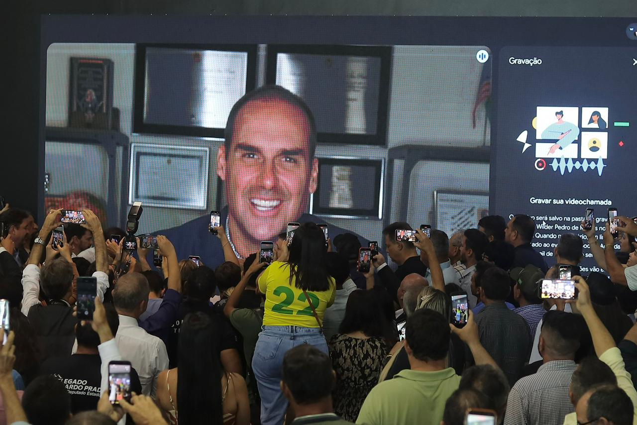 O ex-deputado Eduardo Bolsonaro (PL), que vive atualmente nos Estados Unidos, participou ao vivo por videochamada. “Fico muito feliz em ver este auditório lotado. Goiás é um Estado conservador. Também fico satisfeito que o Partido Liberal tenha tido a maturidade, especialmente sob a liderança do presidente Valdemar da Costa Neto, de lançar a candidatura do senador Wilder Morais, uma pessoa de trajetória e espírito empreendedor”, disse.