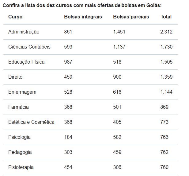 O curso de graduação com o maior quantitativo de bolsas ofertadas no estado é administração, com 2.312 bolsas, sendo 861 integrais e 1.451 parciais. Depois dele, os dois cursos com mais ofertas são: ciência contábeis, com 1.730 bolsas (593 integrais e 1.137 parciais), e educação física, com 1.505 bolsas (987 integrais e 518 parciais).