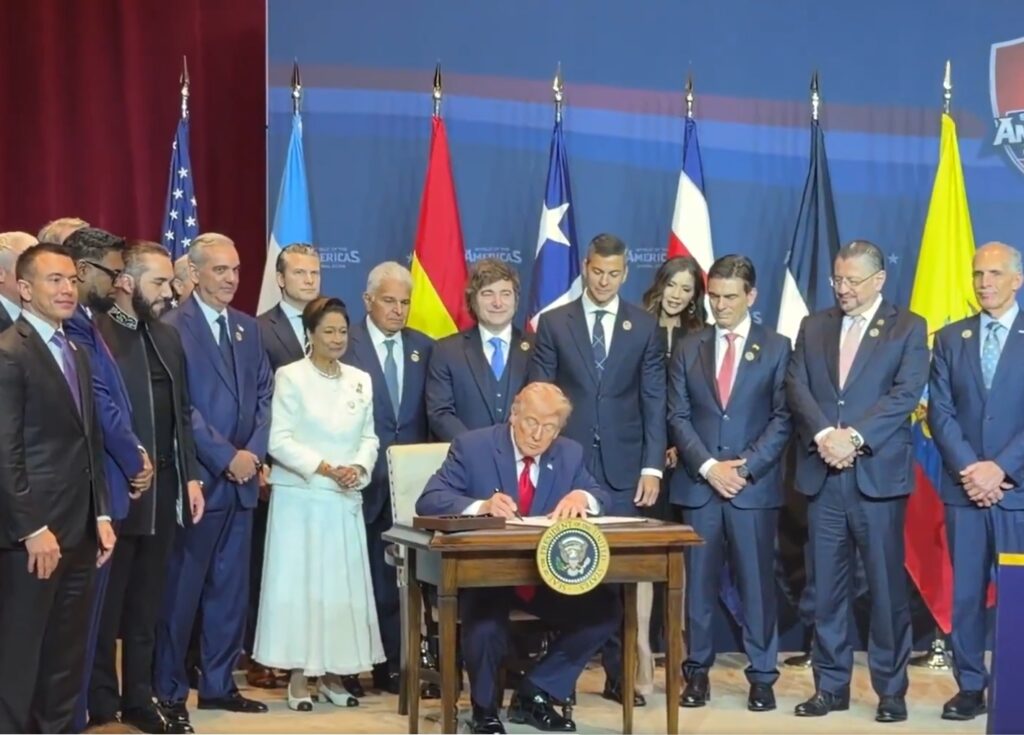 Trump e governantes da América latina durante a cúpula "Escudo das Américas" (Foto: Reprodução/X)