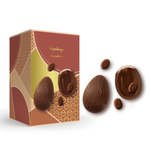 Essa delícia é especial para quem é muito fã de chocolate e avelã. O ovo é uma combinação chocolate ao leite com recheio de avelã com pedaços de avelã. Textura,