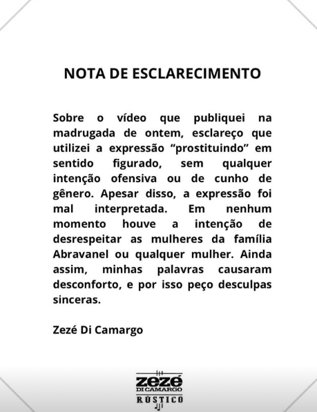 Após receber críticas e de ter a exibição de seu especial cancelado pelo SBT, Zezé se desculpou.”Sobre o vídeo que publiquei na madrugada de ontem, esclareço que publiquei a expressão “prostituindo” em sentido figurado, sem qualquer intenção ofensiva ou de cunho de gênero. Apesar disso, a expressão foi mal interpretada”, diz parte do comunicado, publicado em seus stories do Instagram, modalidade no qual a postagem fica por 24 horas no ar.