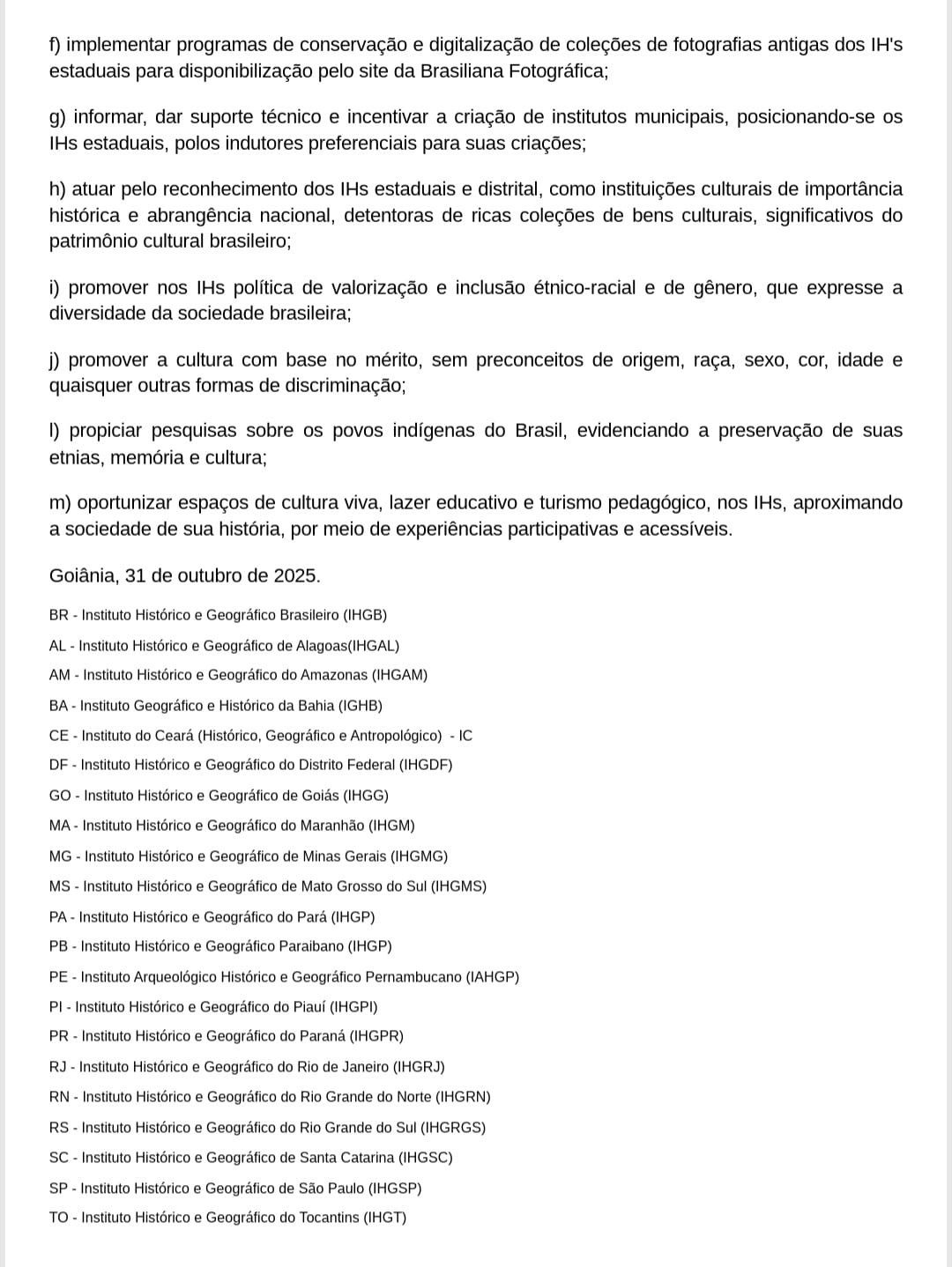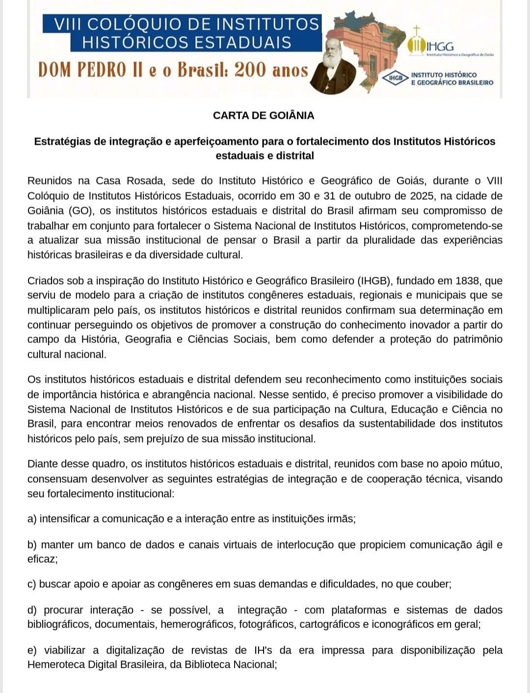 Coroando a iniciativa, foi aprovada, por unanimidade, a “Carta de Goiânia”, documento registrando o significado do evento e apresentando estratégias de integração e aperfeiçoamento para o fortalecimento dos Institutos Históricos estaduais e distrital. Preconizou esforços para "viabilizar a digitalização de revistas de IH's da era impressa, para disponibilização pela Hemeroteca Digital Brasileira, da Biblioteca Nacional; e a implementação de programas de conservação e digitalização de coleções de fotografias antigas dos IH's estaduais, para disponibilização pelo site da Brasiliana Fotográfica".