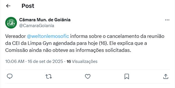 Goiânia - O vereador Welton Lemos, líder da Comissão Especial de Inquérito (CEI) da Limpa Gyn na Câmara de Goiânia, informou que a reunião da comissão marcada para esta terça-feira (16/9) foi cancelada. Segundo ele, o adiamento ocorreu pela ausência das informações solicitadas.