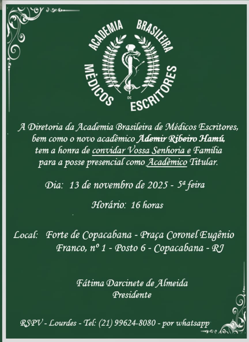 Goiânia - O médico e escritor Ademir Ribeiro Hamú tomará posse como acadêmico titular da Academia Brasileira de Médicos Escritores (Abrames) nesta quinta-feira (13/11), em cerimônia que será realizada às 16h, no Forte de Copacabana, no Rio de Janeiro. Além da posse, nesta sexta-feira (14/11), no mesmo local, o escritor lançará seu mais recente livro, O Outro Lado do Poema, durante a Semana Literária da Academia Brasileira de Médicos Escritores (Abrames).
